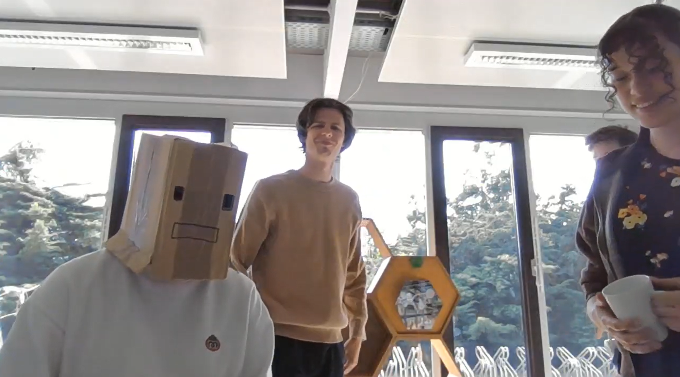 We tested this Robot Expression Tool in our group with the cards of The Restaurant (Location), Does not speak English (Modifier) and Move an Object (Goal), shown in Figure 3.2 above. One person acted as the robot with the box over their head, to remove the facial expression, three other group members acted out a scenario and the last member acted as an observer. Below, in Figure 3.3 till 3.6, are some snapshots and a short clip of our test.