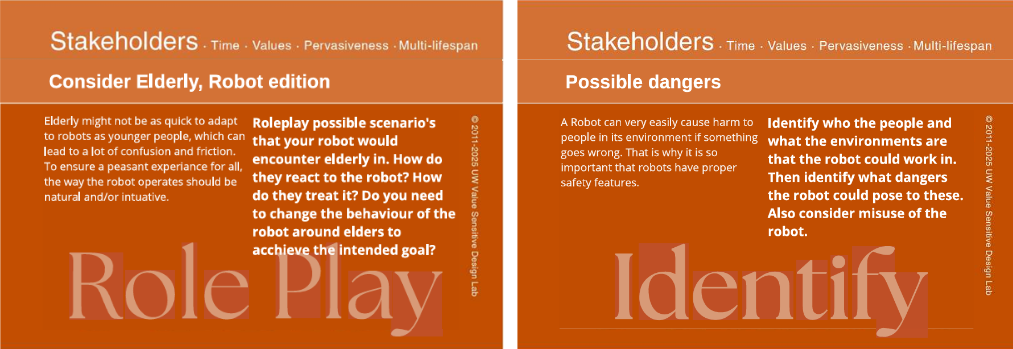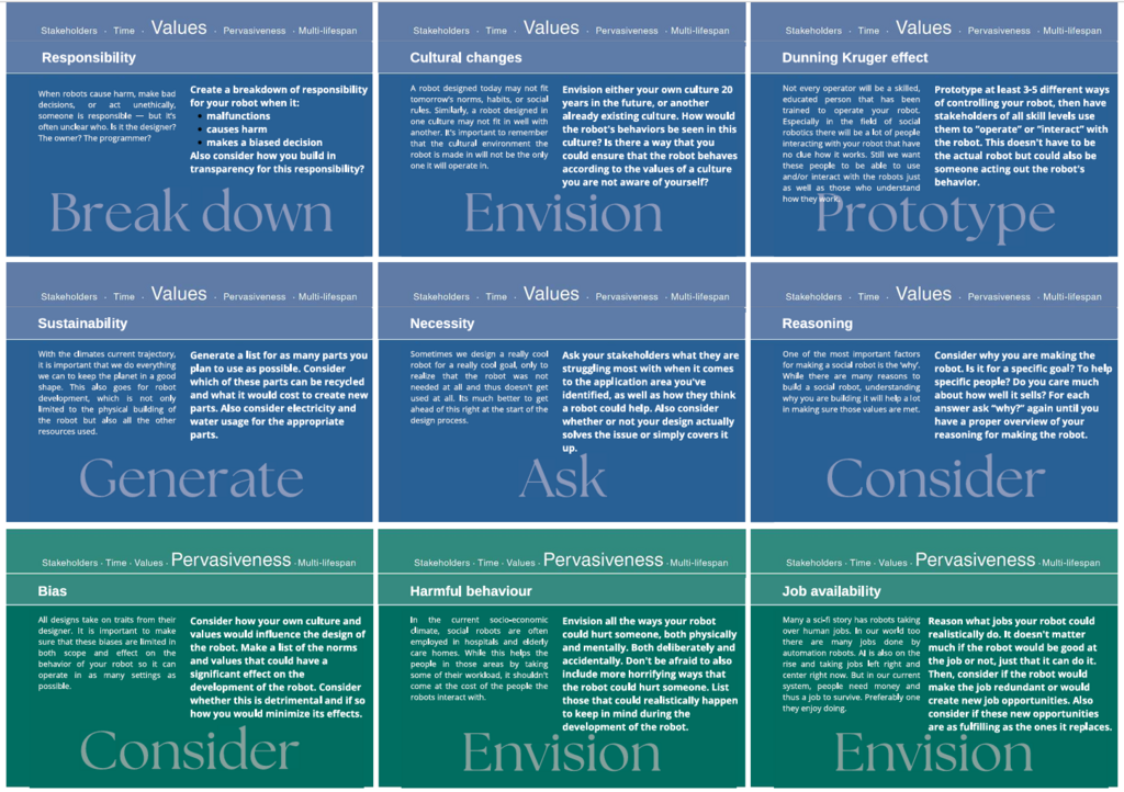 A very important topic when designing Social Robots is Ethics. Therefore, this last tool will focus on exploring both long and short term ethical implications of Social Robots and invoke discussions between the designers. For this tool we were invited to expand on the Envisoning Cards by Friedman [6]. We wanted designers to think about the things they did not know or think about. Within the categories these cards present, (Stakeholder, Time, Pervasiveness, Values) we created thought provoking questions (see Figure 7.1 below). Asking interesting questions to examine ethical concerns has also been done by Mei et al. [7], where they focussed more on the ethical concerns in regards to robots in healthcare. To create more interesting and unique scenarios, we added an option where designers could pick two cards at random which would create a scenario. So for example: Elderly (stakeholder) and Safety features (Stakeholder) invites them to think about safety features implemented when the Social Robot is interacting with Elderly. Designers are invited to name all the things that could go wrong, or how the robot could be unethical. If there is no new input, they can swap out one of the cards or pick two random new ones. They can also pick a few cards that apply to their own scenario if they already have one. However, picking cards at random and creating (sometimes unrealistic) new scenarios does give food for thought on things that would otherwise not have come up.