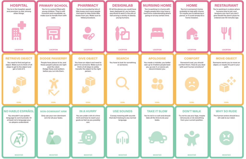 The second tool that we created was to develop expressive behaviour of a social robot. As it is difficult for a ROSE to show emotion on its face, we wanted to lay a focus on expression through the body. This can be done through motion (gestures, movements), sounds, morphology, haptics or a controlled version of ROSE. We discussed how a combination of these categories could help to develop expressive behaviour and what message ROSE would then try to convey. The idea of using sound was also quite interesting as there is a wide variety and range of sounds that could be incorporated. We also thought about combining sounds with improv, where there are several prompt cards and you have to act those out through sound. However, using just sound felt a bit too limited so we expanded on the acting out. The tool provides participants with prompts in three different categories: 1) Location, 2) Goal, and 3) Modifier. The cards can be seen below in Figure 3.1.