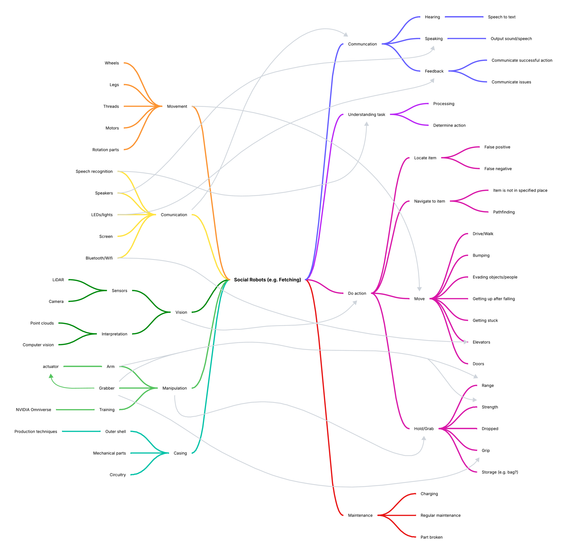 We eventually chose to work out ROSE as a fetching robot in elderly care. We started brainstorming on the problem space and created a mindmap. We expanded on this mindmap with possible building blocks and other applications. We then created links between both sides of the mindmap. The end result can be found below in Figure 1.2. Wizard of Oz could be applied to all driving and fetching, meaning that ROSE would be remote controlled to ensure it can drive around and fetch things. It can be translated into a theatrical exercise by trying to ask ROSE to fetch something and show how the interaction between ROSE and the user could proceed.