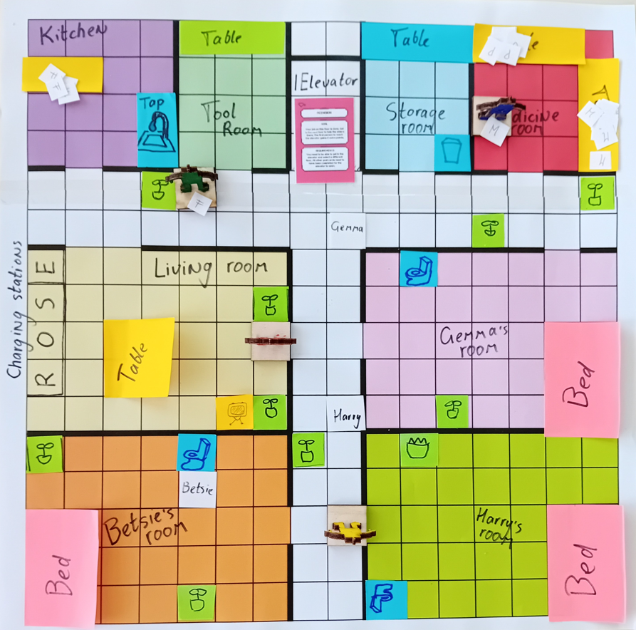 A game environment did feel more fitting and was closer to what we wanted to achieve, but creation of an online game is still quite a handful to do in the limited time we still had. We eventually settled on our final design for the tool: a board game. The possible effectiveness of a serious board game is shown by Sousa [4], who even adapted existing board games into serious board games, with positive results. The first sketch made during brainstorming is shown below in Figure 6.3. The board itself is the space where the robot is designed for, in our case an elderly home. It has different rooms and spaces such as personal rooms, a kitchen and a medical bay. The final ‘boss’ is to be able to enter the elevator.