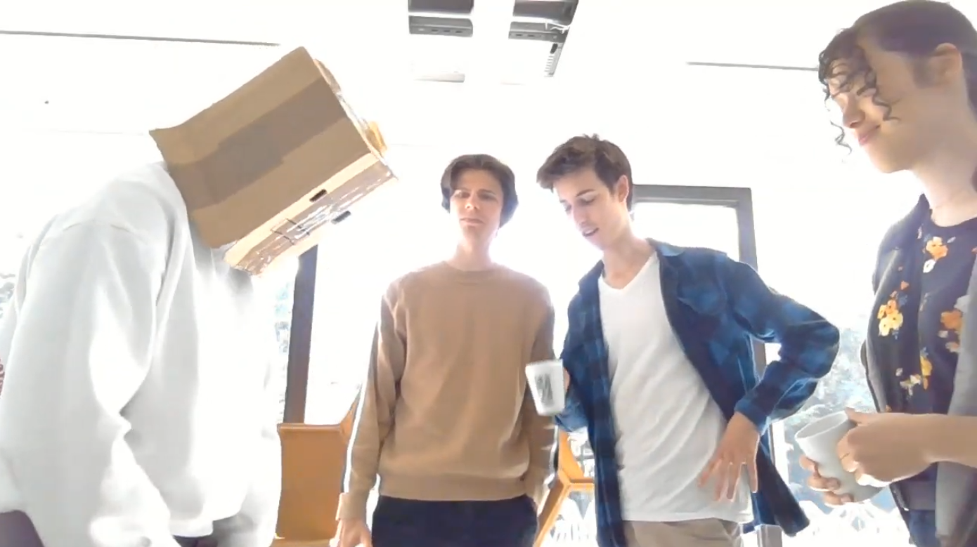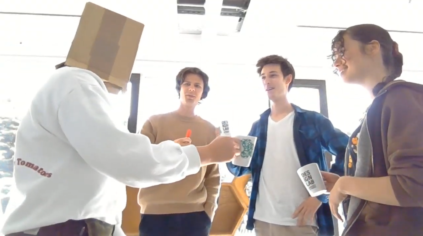 We tested this Robot Expression Tool in our group with the cards of The Restaurant (Location), Does not speak English (Modifier) and Move an Object (Goal), shown in Figure 3.2 above. One person acted as the robot with the box over their head, to remove the facial expression, three other group members acted out a scenario and the last member acted as an observer. Below, in Figure 3.3 till 3.6, are some snapshots and a short clip of our test.