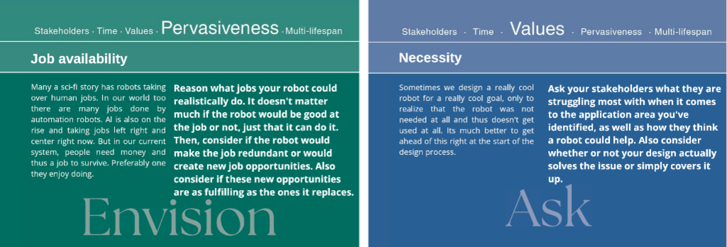 A very important topic when designing Social Robots is Ethics. Therefore, this last tool will focus on exploring both long and short term ethical implications of Social Robots and invoke discussions between the designers. For this tool we were invited to expand on the Envisoning Cards by Friedman [6]. We wanted designers to think about the things they did not know or think about. Within the categories these cards present, (Stakeholder, Time, Pervasiveness, Values) we created thought provoking questions (see Figure 7.1 below). Asking interesting questions to examine ethical concerns has also been done by Mei et al. [7], where they focussed more on the ethical concerns in regards to robots in healthcare. To create more interesting and unique scenarios, we added an option where designers could pick two cards at random which would create a scenario. So for example: Elderly (stakeholder) and Safety features (Stakeholder) invites them to think about safety features implemented when the Social Robot is interacting with Elderly. Designers are invited to name all the things that could go wrong, or how the robot could be unethical. If there is no new input, they can swap out one of the cards or pick two random new ones. They can also pick a few cards that apply to their own scenario if they already have one. However, picking cards at random and creating (sometimes unrealistic) new scenarios does give food for thought on things that would otherwise not have come up.
