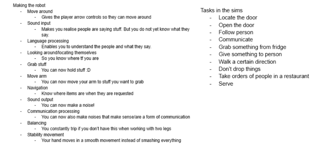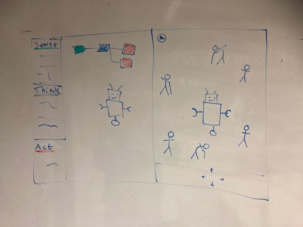 This week's challenge is to create a tool that will help prototyping (high level) robot behaviour, preferably without the use of Wizard of Oz. As we did not want to make use of Wizard of Oz and getting an actual robot was a bit expensive, we started to look into virtual robots. Our initial idea was to create a tool that would allow users to design and test their robot in a Sims like universe: 1) One would first program and design their own simple robot. 2) Once finished they receive tasks to complete. 3) Doing these tasks would give insight into the behaviour of the robot and what is still missing.