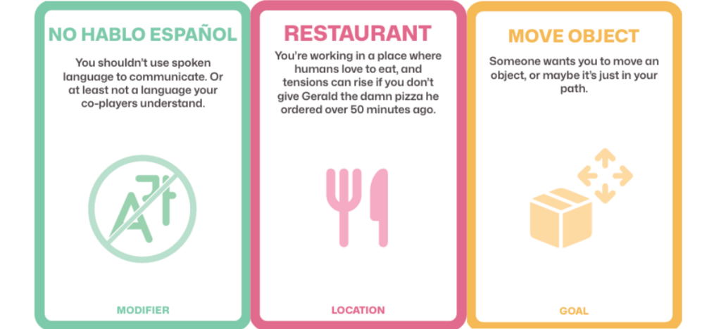 The second tool that we created was to develop expressive behaviour of a social robot. As it is difficult for a ROSE to show emotion on its face, we wanted to lay a focus on expression through the body. This can be done through motion (gestures, movements), sounds, morphology, haptics or a controlled version of ROSE. We discussed how a combination of these categories could help to develop expressive behaviour and what message ROSE would then try to convey. The idea of using sound was also quite interesting as there is a wide variety and range of sounds that could be incorporated. We also thought about combining sounds with improv, where there are several prompt cards and you have to act those out through sound. However, using just sound felt a bit too limited so we expanded on the acting out. The tool provides participants with prompts in three different categories: 1) Location, 2) Goal, and 3) Modifier. The cards can be seen below in Figure 3.1.