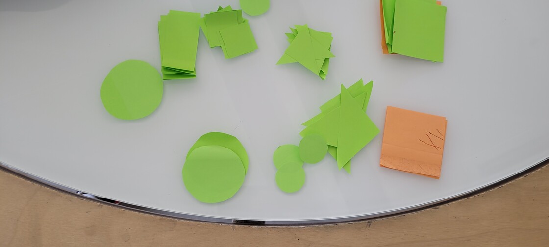 Eventually, in the spirit of simplicity, the final tool consists of a lot of different basic paper shapes that designers can combine into any form they want. The use of paper makes it easy to set up and move around and it can be easily modified by drawings of the designers. The setup can be seen below in Figure 4.1. This tool allows for full creative freedom and allows designers to be inspired by simplicity. A similar approach has been done by Voges et al. [5A] who created a creative toolkit for the embodiment of Social Robots. Their kit does contain more robotic shapes, but they also reflect that using those limits the amount of novel ideas. Voges et al. found that the use of the kit allows for a creative approach and has a low threshold even for those without a Social Robot background.
